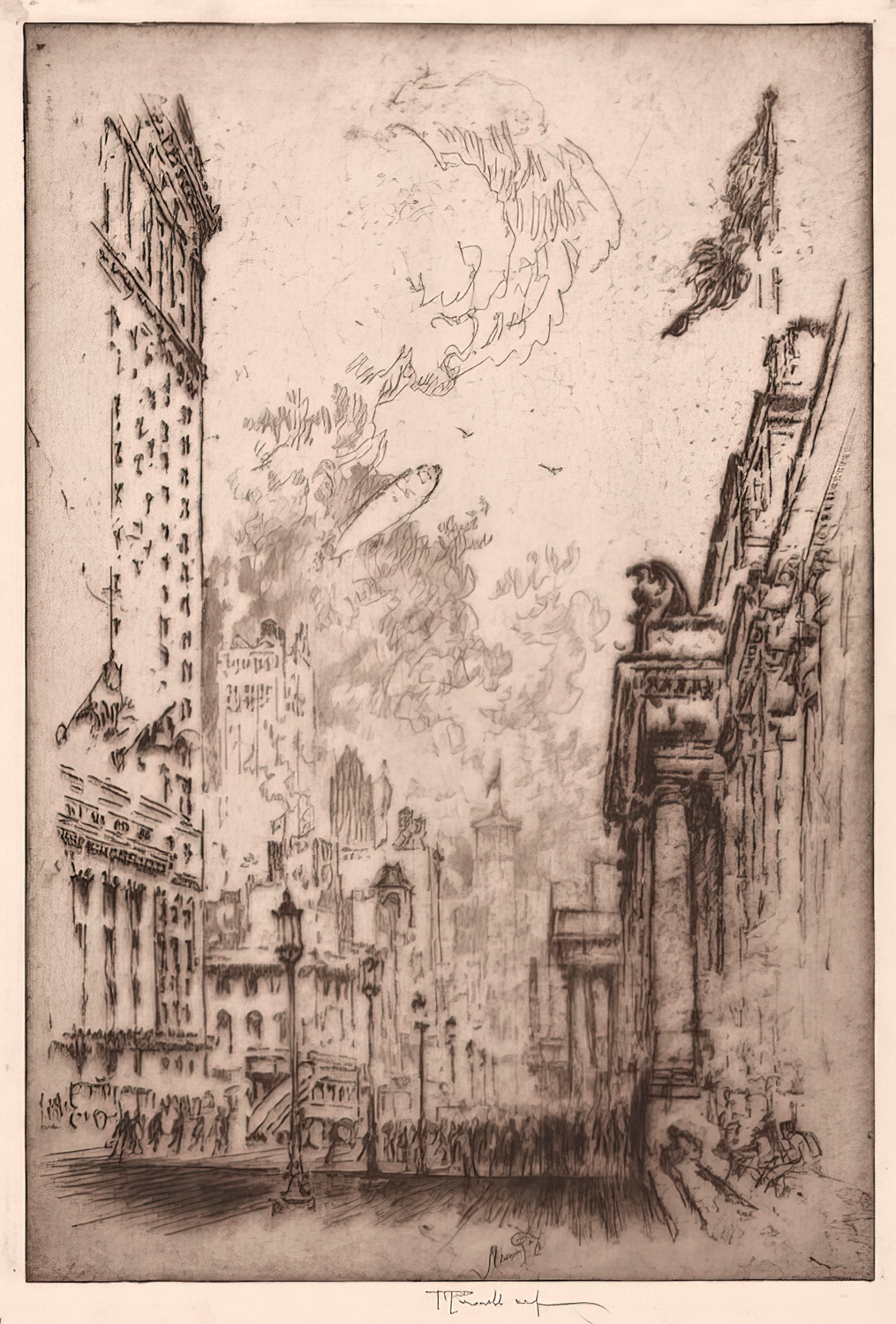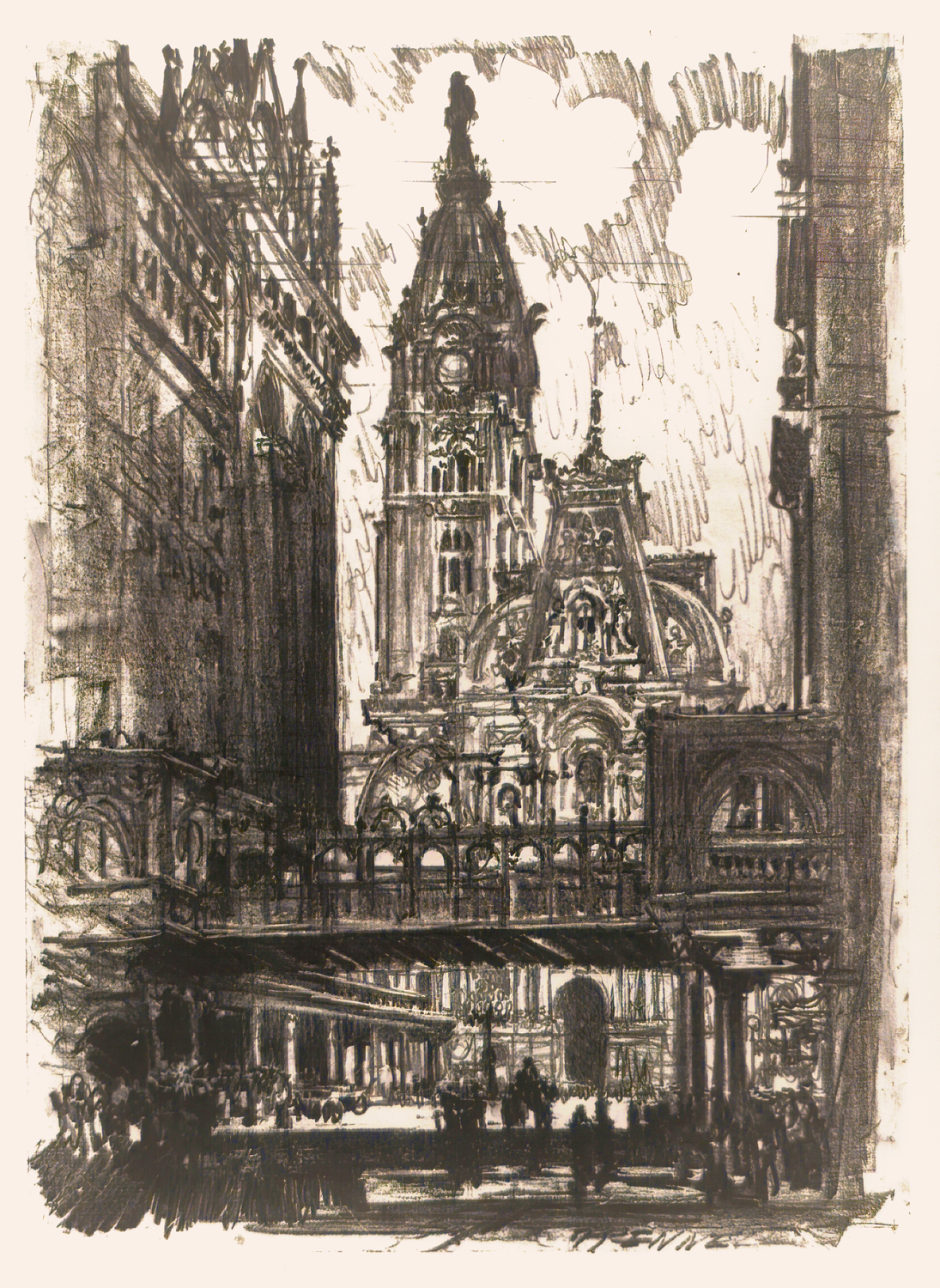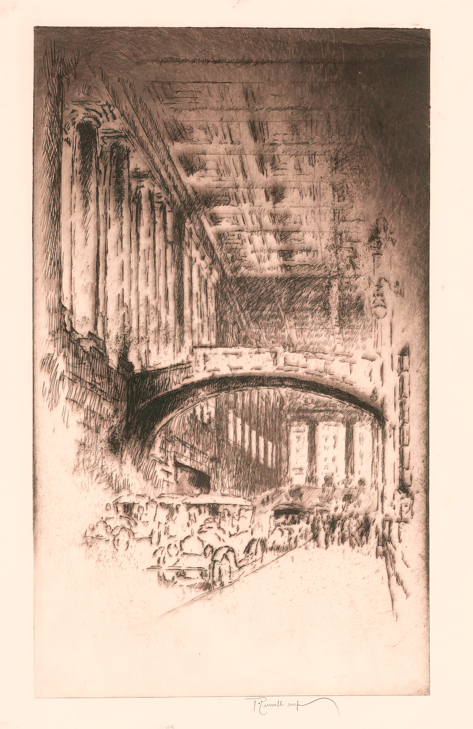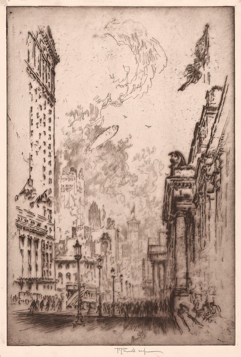 Pennell’s early printmaking work was predominantly in the technique of intaglio, but he later came to prefer the process of lithography. No matter which technique he used, Pennell had an incredible talent of conveying textures and emotions through his artful linework. He zealously attended to detail and was quite the perfectionist—trusting no one but himself to pull prints from his plates, and subsequently destroying his own plates after 50 printings to prevent the possibility of anyone finding them and attempting to print degraded images from them later.