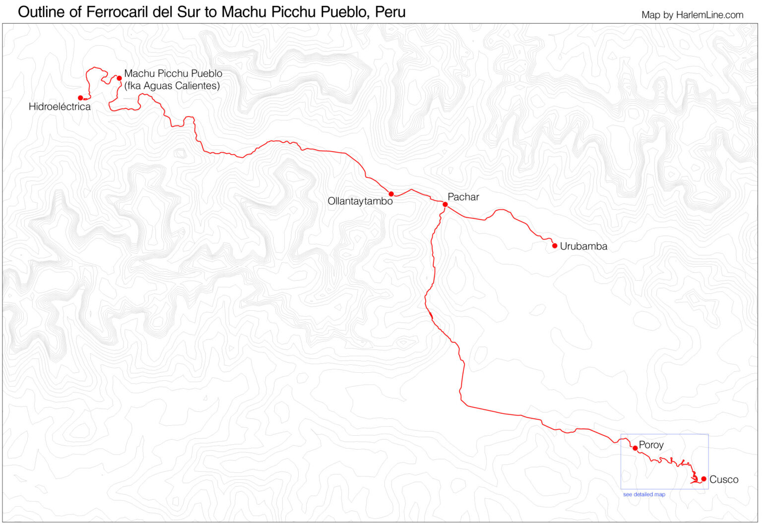 The Urubamba branch, which extends from the Tambo del Inka hotel in Urubamba (elevation 2851m, and yes, of course I stayed at the hotel that had its very own train station!), joins up with the line at Pachar (elevation 2813m), a stone’s throw from the main midpoint station of Ollantaytambo (elevation 2804m). Then mirroring the path of the Urubamba River, the line traverses a series of tunnels before reaching Machu Picchu Pueblo (elevation 2080m). Most service terminates here, although a few trains daily carry passengers further to the end of the line at Hidroeléctrica (elevation 1794m, historically the line continued northward to Quillabamba, but was abandoned due to landslides).