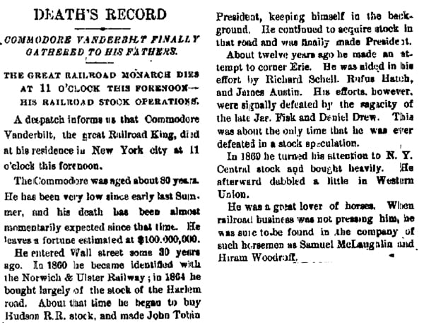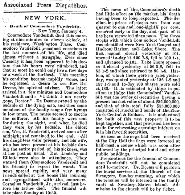 Articles from various newspapers, published on the 4th and 5th of January, 1877, after the death of Cornelius Vanderbilt.