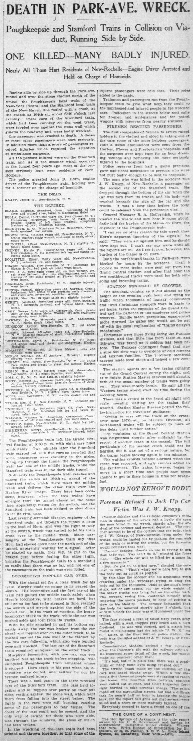 1905 Newspaper Article, Park Avenue Wreck – One Killed