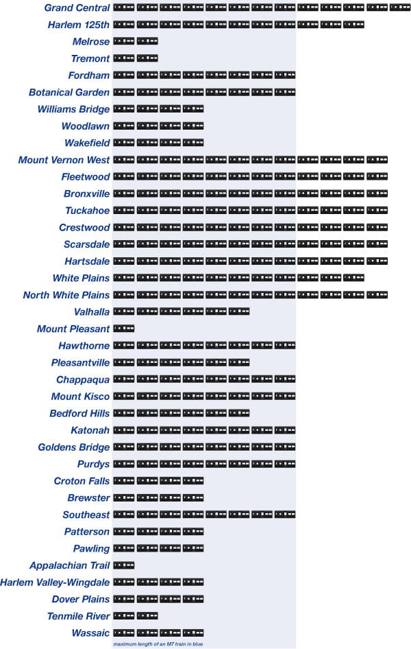 This map shows the order of the stations on the Harlem Line, and displays how many train cars can stop at each station. The maximum size M7 train length (eight cars) is highlighted in blue. The amount of cars on your train will differ based on time, day, and route. If you’re not sure how many cars there are, the conductor will be able to help you.