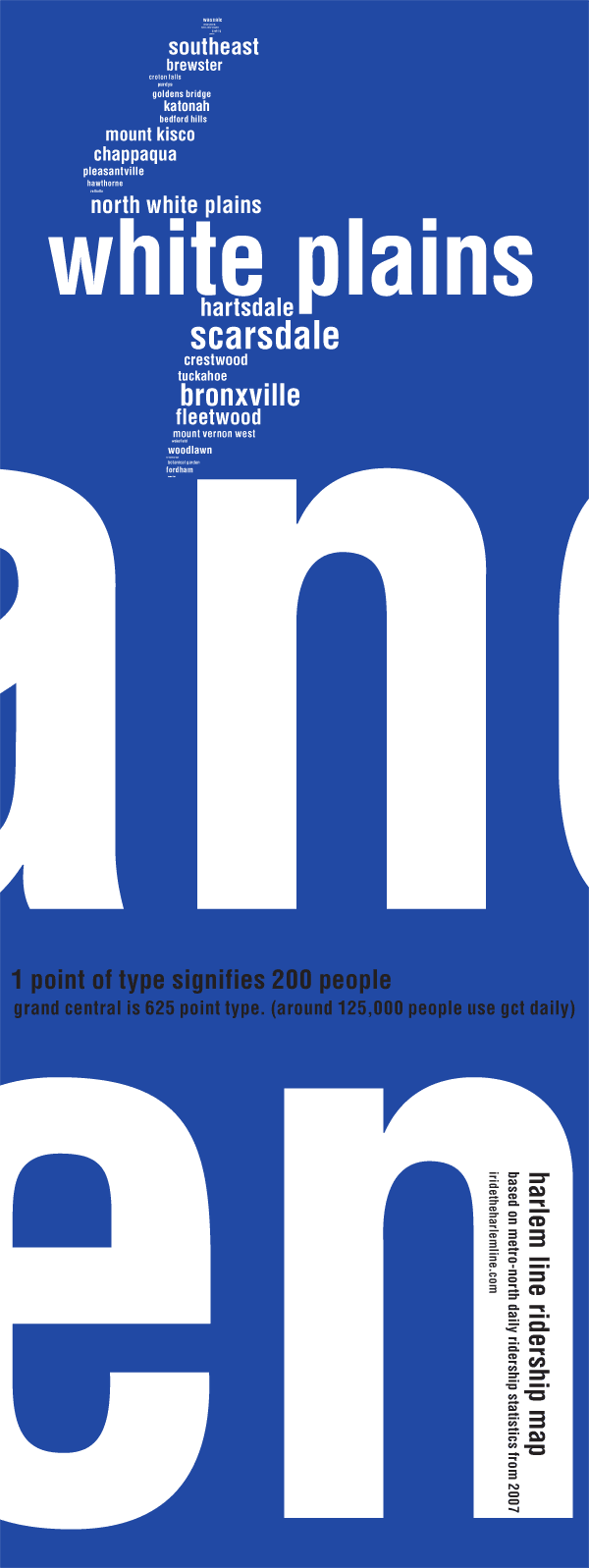 Obviously not much help in navigating, this map gives the viewer the idea of how many people pass through the various stations on the Harlem Line daily, in a vague outline of the line. The bigger the text, the more riders that station has daily. A few stations have so few riders in comparison, thus they are impossible to see on this map. Grand Central is so incredibly large that it has been cropped in order to see the rest of the stations.